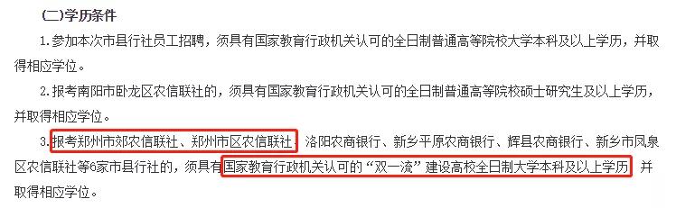 从近两年农商行招聘条件中可以看出:郑州市郊、市区农信社学历要求高于其他行社。17年市郊农信社要求第一学历为985、211高等院校全日制本科学历,18年两家联社要求具有“双一流”建设高校全日制本科学历。学历要求可以说是一年比一年高,准备报考这两家的考生,可以参考一下。